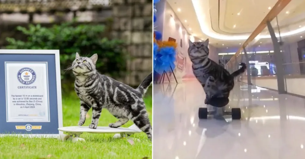 Bao Zi, một chú mèo lông ngắn Mỹ thuộc sở hữu của người đàn ông Trung Quốc Li Jiangtao, đã thể hiện kỹ năng trượt ván của mình bằng cách trượt ván 10 mét -- 32,8 feet -- trong 12,85 giây.