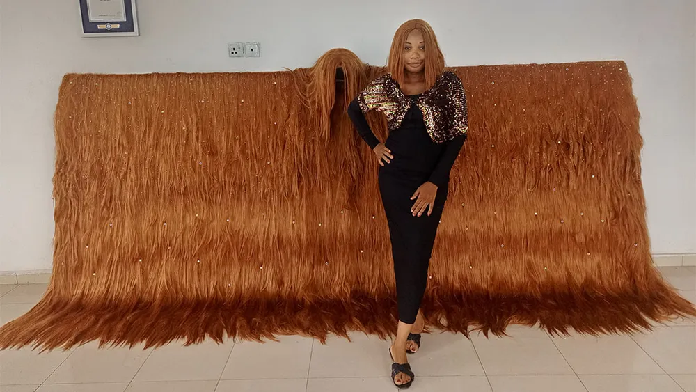 Williams, một thợ làm tóc giả chuyên nghiệp ở Nigeria, cho biết cô đã sử dụng hơn 800 bó tóc thật để làm bộ tóc giả phá kỷ lục của mình, sau đó trang trí bằng 1.000 viên kim cương giả và trưng bày trong văn phòng của cô.