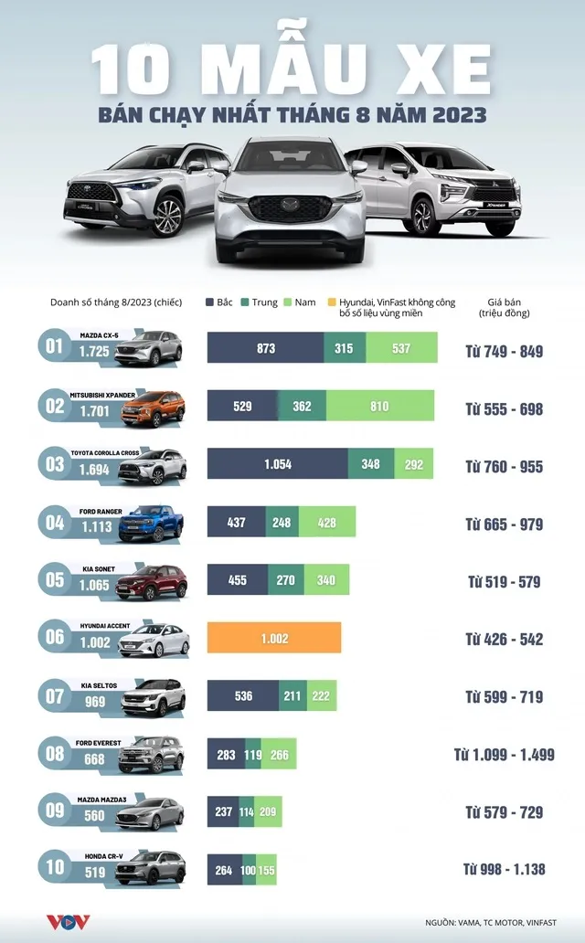 10 mẫu xe ô tô bán chạy nhất tháng 8/2023
