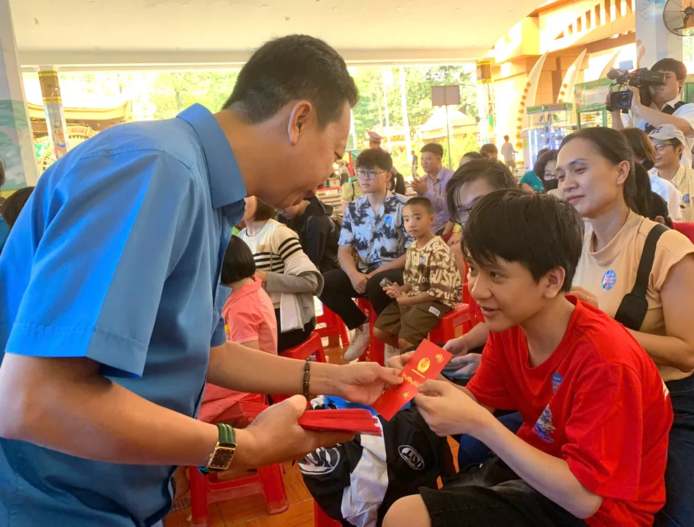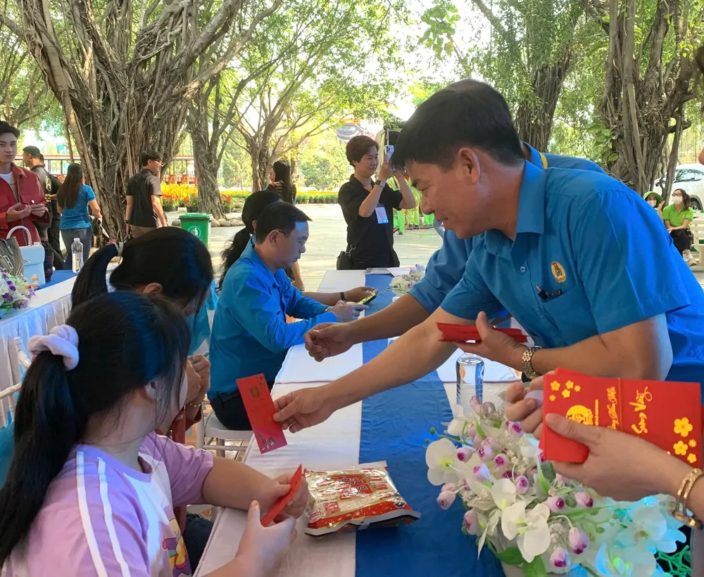 Phó Chủ tịch LĐLĐ TPHCM Phạm Chí Tâm trao Lì xì đến con của công nhân