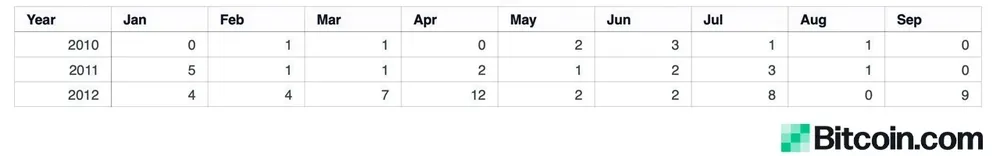 Các giao dịch liên quan đến số BTC cổ điển từ năm 2010, 2011 và 2012 là không phổ biến. Tuy nhiên, tháng 9 này đã chứng kiến 9 giao dịch từ các địa chỉ không hoạt động từ năm 2012 | Nguồn: BTCparser.com