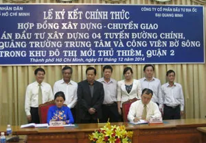 (ĐTTC)- Sáng 1-12, tại trụ sở UBND TPHCM, CTCP Đầu tư Địa ốc Đại Quang Minh và Tổ Công tác liên ngành đã ký kết chính thức Hợp đồng xây dựng- chuyển giao dự án 4 tuyến đường chính, dự án quảng trường trung tâm và công viên bờ sông trong khu đô thị mới Thủ Thiêm (ảnh).