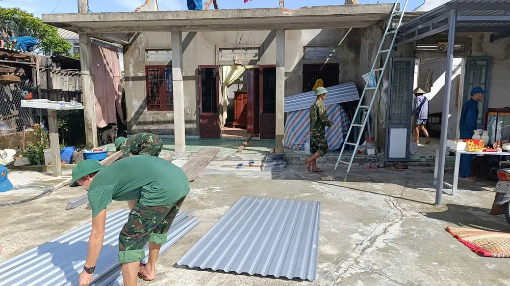 Tại xã Quảng Điền, Bộ CHQS TP Huế điều động hơn 60 cán bộ chiến sĩ bộ đội và dân quân địa phương khẩn trương giúp nhân dân khắc phục, sữa chữa và lợp lại những ngôi nhà bị bão số 10 làm tốc mái, hư hỏng.