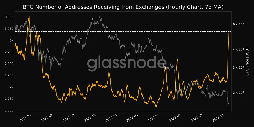 Dữ liệu này của Glassnode đưa ra mức trung bình hàng giờ hơn 3.000 địa chỉ rút tiền trong 7 ngày tính đến ngày 13-11.