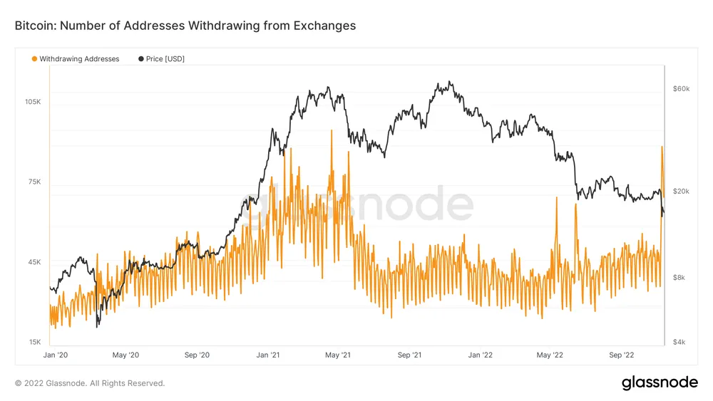 Theo dữ liệu mới từ công ty phân tích on-chain Glassnode cho thấy số lượng ví nhận BTC từ các địa chỉ sàn giao dịch đạt gần 90.000 vào ngày 9-11.