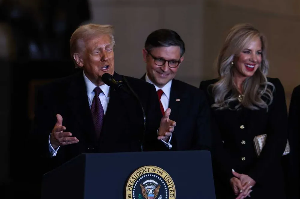 Ông Trump phát biểu trước đám đông cùng với Chủ tịch Hạ viện Mike Johnson tại khu vực xem dành cho khách VIP ở Emancipation Hall sau lễ nhậm chức của ông tại Điện Capitol Hoa Kỳ. Hình ảnh Getty