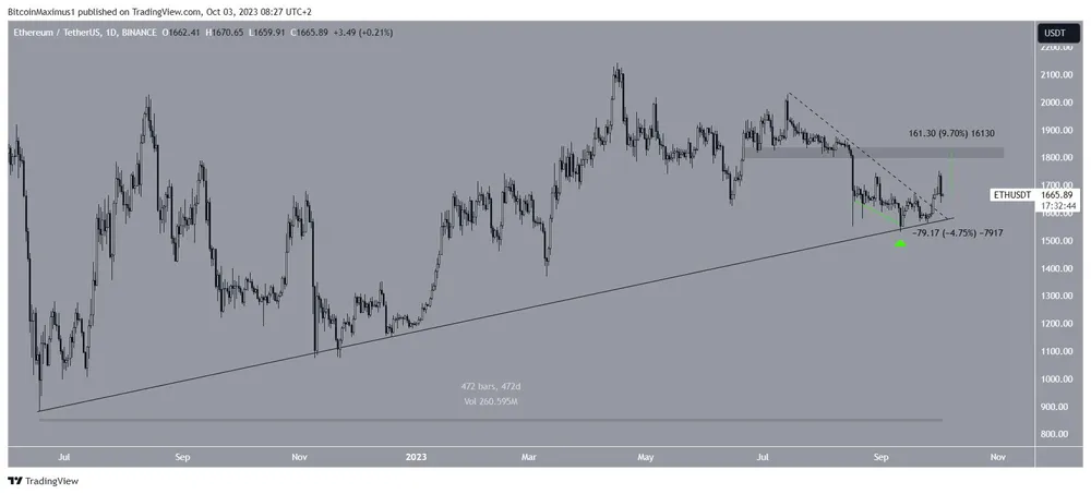 Giá Ethereum đã tăng kể từ ngày 11-9, khi nó bật lên từ đường hỗ trợ tăng dần dài hạn. Cho đến nay, đường này đã hoạt động được 472 ngày.