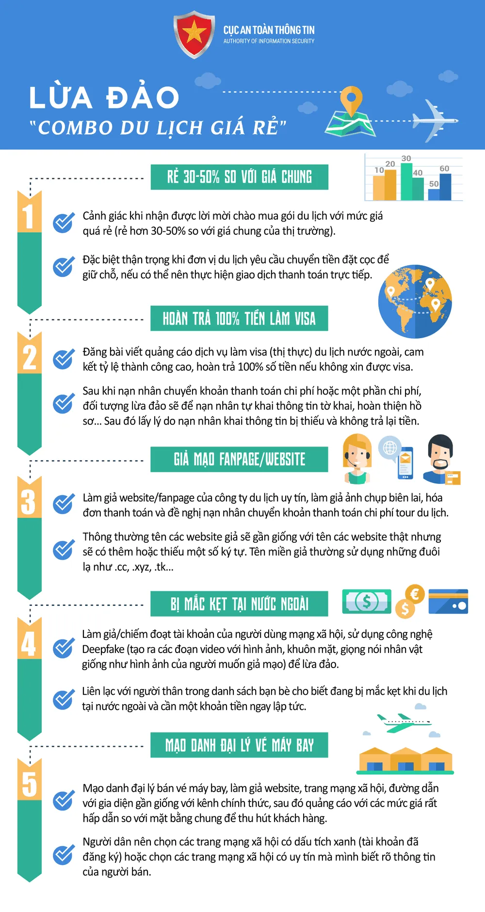 Cục An toàn Thông tin khuyến cáo người dân cảnh giác khi thực hiện giao dịch trên mạng xã hội, nhất là với các quảng cáo giá siêu rẻ và ưu đãi lớn. Khi có nhu cầu mua vé máy bay, người dân nên trực tiếp đặt vé qua website chính của hãng hàng không hoặc gọi trực tiếp lên tổng đài.