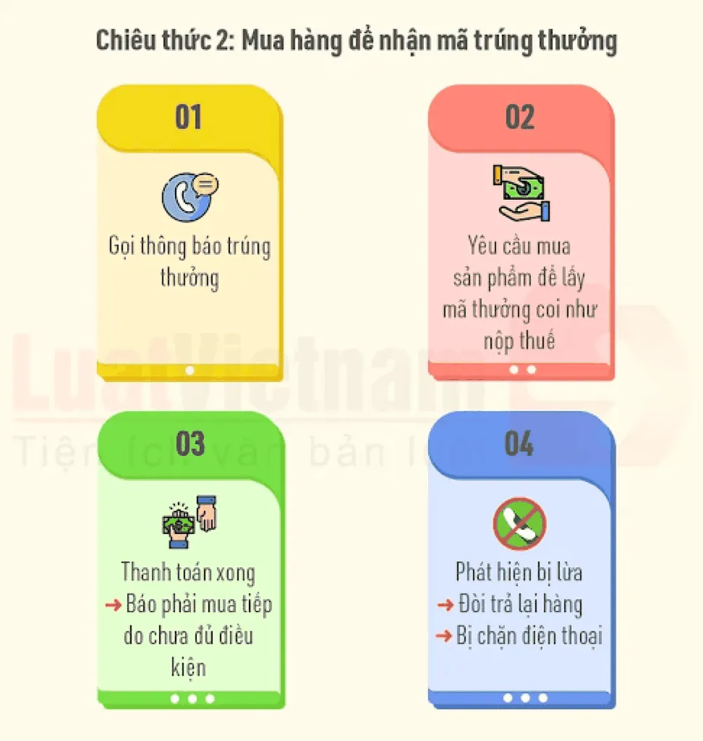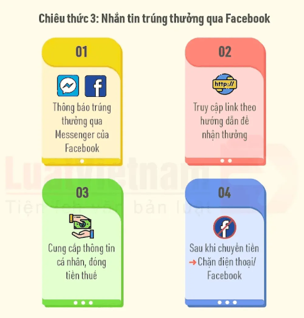 Lừa đảo chiếm đoạt thông qua hình thức "nhận quà trúng thưởng" là một chiêu trò không còn mới. Các đối tượng thường liên hệ với nạn nhân thông qua hình thức gọi điện thông báo trúng thưởng và thường sẽ thiên biến theo nhiều cách thức khác nhau như: Gọi điện thông báo trúng thưởng, mua hàng để nhận mã trúng thưởng, nhắn tin trúng thưởng qua Facebook.