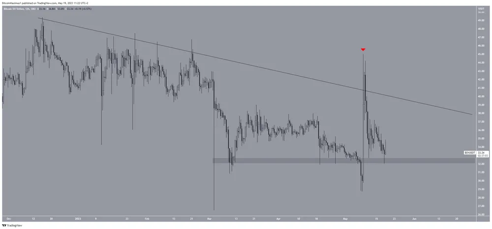 Giá BSV đã giảm bên dưới đường kháng cự giảm dần kể từ tháng 12-2022. Gần đây nhất, đường này đã từ chối giá vào ngày 9-5 (biểu tượng màu đỏ). Điều này bắt đầu phong trào đi xuống đang diễn ra. Hiện tại, giá BSV giao dịch bên trong vùng hỗ trợ ngang 32 USD.