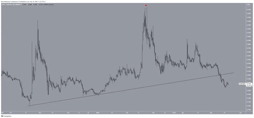 Giá KLAY đã giảm kể từ khi đạt mức cao hàng năm ở 0,37 USD vào ngày 22-5 (biểu tượng màu đỏ). Giá đã phá vỡ một đường hỗ trợ tăng dần vào ngày 11-5. Vì đường này đã tồn tại từ tháng 10, nên việc phá vỡ xuống dưới nó là dấu hiệu cho thấy xu hướng tăng trước đó đã kết thúc và một xu hướng giảm mới đã bắt đầu.