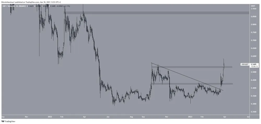 Giá XRP đã bứt phá lên trên đường kháng cự giảm dần vào ngày 21-3 và đạt mức cao hàng năm mới ở 0,585 USD vào ngày 29-3. Đây là mức cao nhất kể từ tháng 9-2022. Hiện tại, giá đang cố gắng xác thực vùng ngang 0,530 USD làm hỗ trợ.
