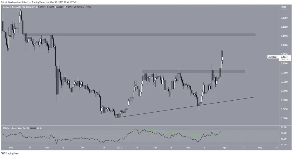 Giá XLM đã tăng kể từ khi bật lên từ đường hỗ trợ tăng dần vào ngày 10-3 (biểu tượng màu xanh lục). Vào ngày 28-3, nó đã bứt phá vùng kháng cự ngang 0,095 USD, dẫn đến mức cao hàng năm mới ở 0,107 USD vào ngày hôm sau. Vùng 0,095 USD hiện được kỳ vọng sẽ cung cấp hỗ trợ.