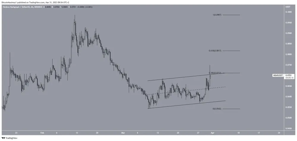 Vào ngày 31-3, giá HBAR đã bị từ chối bởi cả đường kháng cự của kênh và mức kháng cự Fib thoái lui 0,382 ở mốc 0,071 USD.