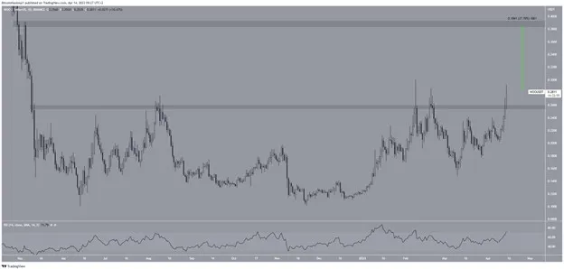 Giá WOO đã tăng kể từ ngày 9-4, động thái này đã giúp tiền điện tử bứt phá lên trên vùng kháng cự ngang 0,26 USD vào ngày 14-4, tạo ra một nến tăng giá lớn.