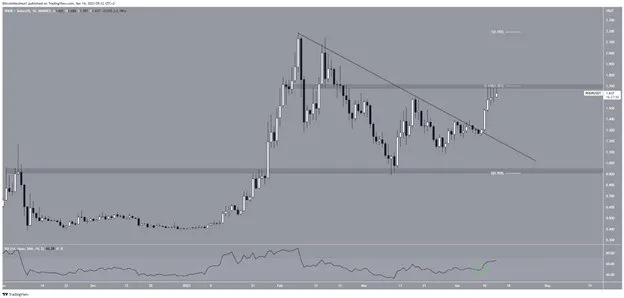Giá RNDR đã bứt phá lên trên đường kháng cự giảm dần vào ngày 10-4. Sự bứt phá này cũng được kết hợp với chuyển động lên trên 50 của RSI (vòng tròn màu xanh lá cây). Tiền điện tử tăng lên mức cao 1,70 USD trong hai ngày sau đó. Hiện tại, giá giao dịch dưới vùng kháng cự Fib và ngang 1,70 USD.