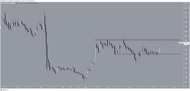 Giá SOL đã tăng lên kể từ ngày 10-3. Nó tạo ra một đáy cao hơn vào ngày 9-4 trước khi đẩy nhanh tốc độ tăng. Giá hiện đang tiếp cận vùng kháng cự 26 USD. Nếu nó bứt phá, mức kháng cự tiếp theo sẽ là 36 USD.