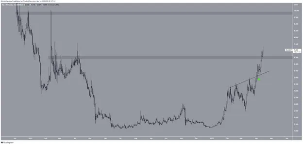 Giá INJ đã tăng cao hơn kể từ khi bứt phá lên trên đường kháng cự tăng dần và xác nhận nó là hỗ trợ vào ngày 6-4 (biểu tượng màu xanh lá cây). Giá đã tăng nhanh sau đó và bứt phá vùng kháng cự 6,50 USD vào ngày 12-4.
