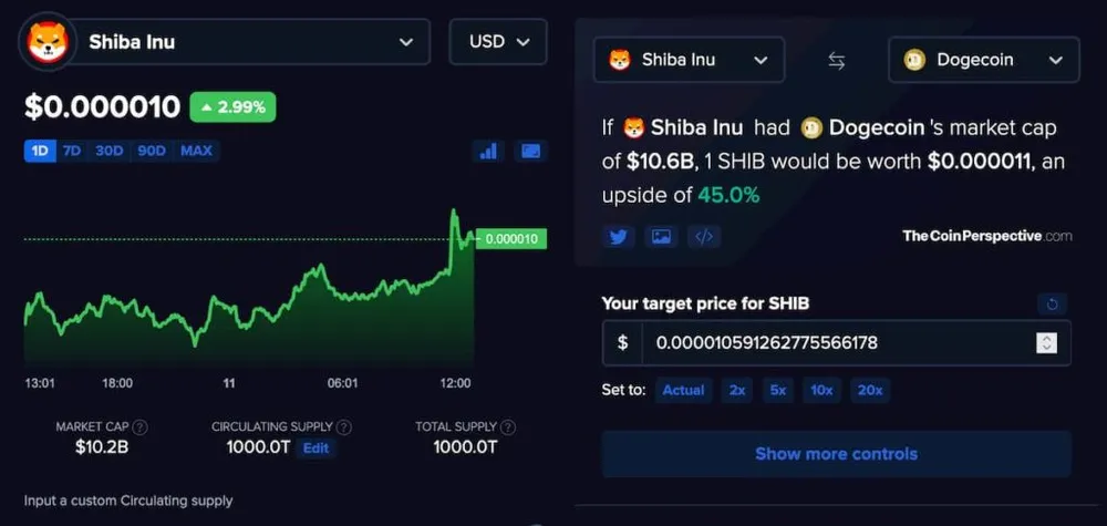 Theo dữ liệu từ The Coin Perspective, nếu SHIB có vốn hóa thị trường của DOGE là 10,6 tỷ USD, thì 1 SHIB sẽ trị giá 0,000011 USD, cao hơn 45% so với giá và vốn hóa định giá pha loãng hoàn toàn (FDV) hiện tại của SHIB là 10,2 tỷ USD.