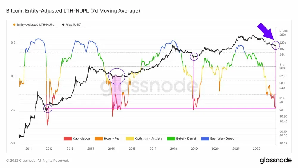 Trong suốt lịch sử của Bitcoin, số liệu NUPL chỉ cho thấy mức giảm lớn như vậy trong 4 lần.