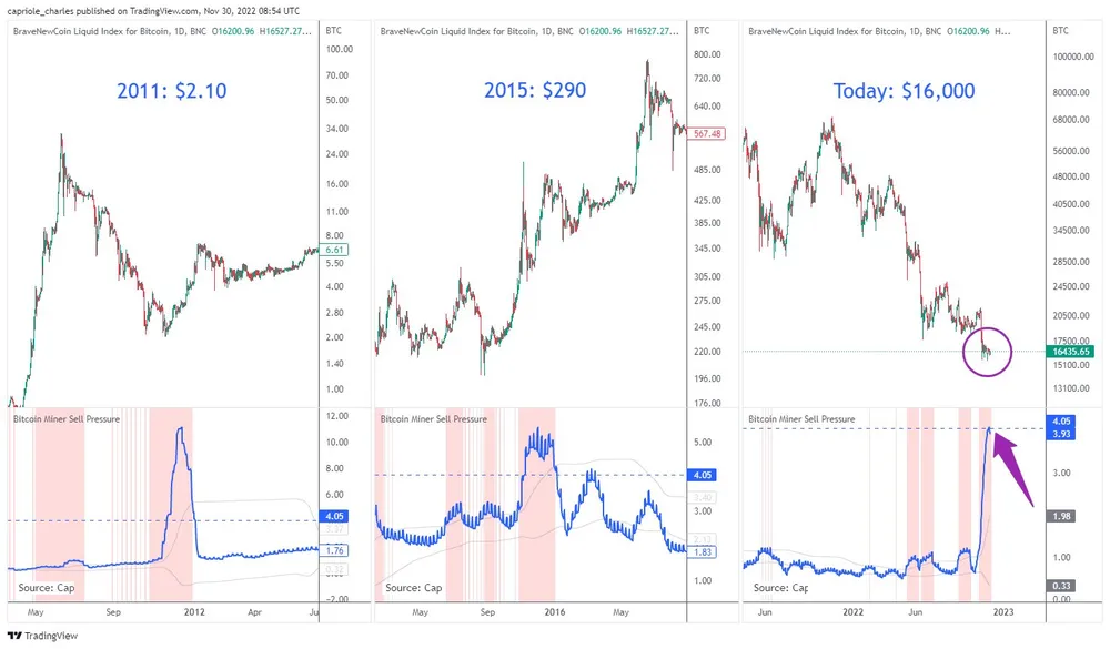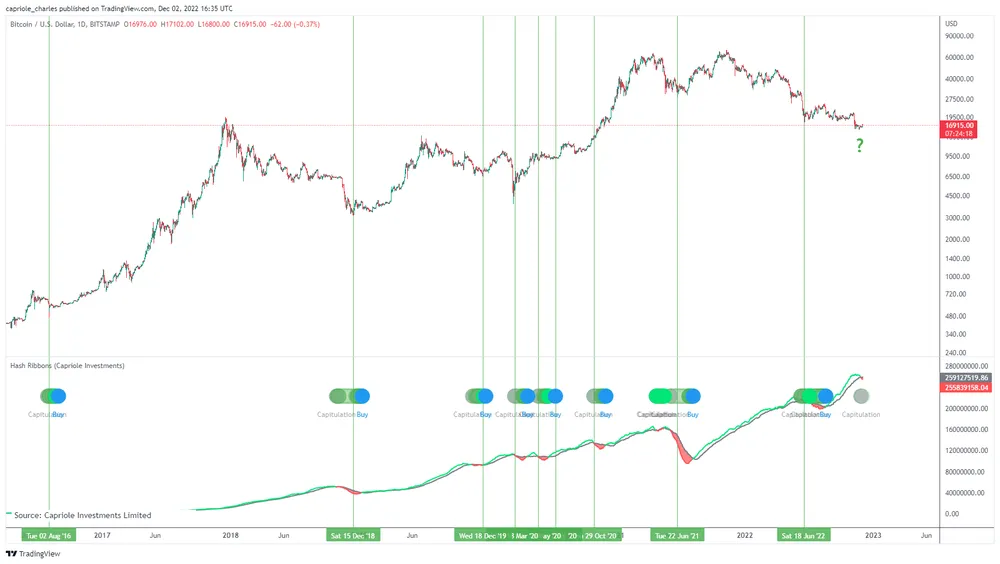 Theo Capriole Investments, trong quá trình thợ đào đầu hàng, giá sàn hình thành trước khi hashrate bắt đầu cải thiện. Như đã lưu ý trong biểu đồ bên dưới, một đợt đầu hàng khác của thợ đào đã xảy ra vào ngày 28-11 và nếu phân tích là chính xác, điều này sẽ đặt đáy của Bitcoin ở mức khoảng 16.915 USD vì hashrate bắt đầu tăng sau ngày 28-11.