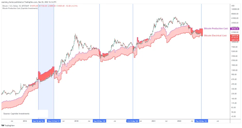 Theo lịch sử, chi phí điện thô là mức giá sàn của Bitcoin vì rất hiếm khi BTC giao dịch dưới mức này. Trong lịch sử, Bitcoin chỉ giao dịch dưới giá điện 4 lần, lần gần đây nhất là vào ngày 10-11 khi giá điện cho tiền điện tử hàng đầu đạt 16.925 USD.