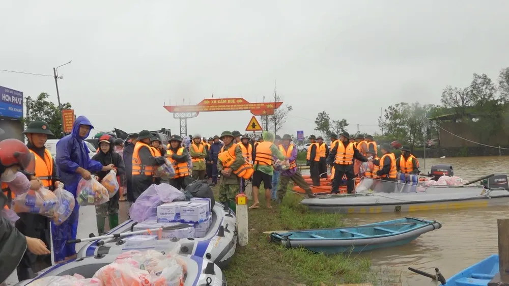 Các lực lượng vận chuyển nhu yếu phẩm, nước lọc hỗ trợ người dân vùng ngập lụt ở xã Cẩm Duệ