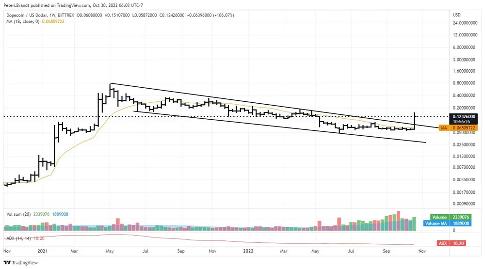 Trader kỳ cựu Peter Brandt đã chia sẻ phân tích của mình về DOGE vào chủ nhật 30-10. Tweet một biểu đồ của DOGE, Brandt đã viết: