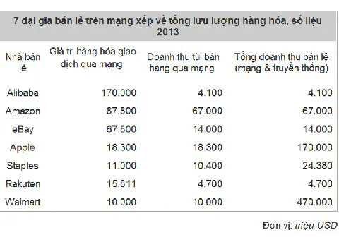Bên cạnh đó, cũng có những doanh nghiệp bán lẻ không phát triển mạnh kênh phân phối qua mạng, như trường hợp của Walmart. Đây là chuỗi siêu thị lớn nhất thế giới với lượng nhân viên lên tới 2 triệu người. Doanh thu của hãng trong năm 2013 đạt con số khổng lồ 470 tỷ USD, nhưng doanh thu từ hoạt động bán qua mạng kém hơn nhiều ở 10 tỷ USD.