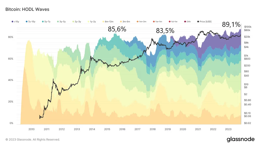 Sóng HODL hiện đang hiển thị áp dụng cho tất cả các nhóm tuổi trên 3 tháng. Trên biểu đồ dải của những người nắm giữ dài hạn, từ màu vàng đến màu tím, chúng ta thấy mức cao mới mọi thời đại (ATH). Hiện tại, có tới 89,1% nguồn cung BTC không được di chuyển, không được giao dịch và không được đổi chủ.