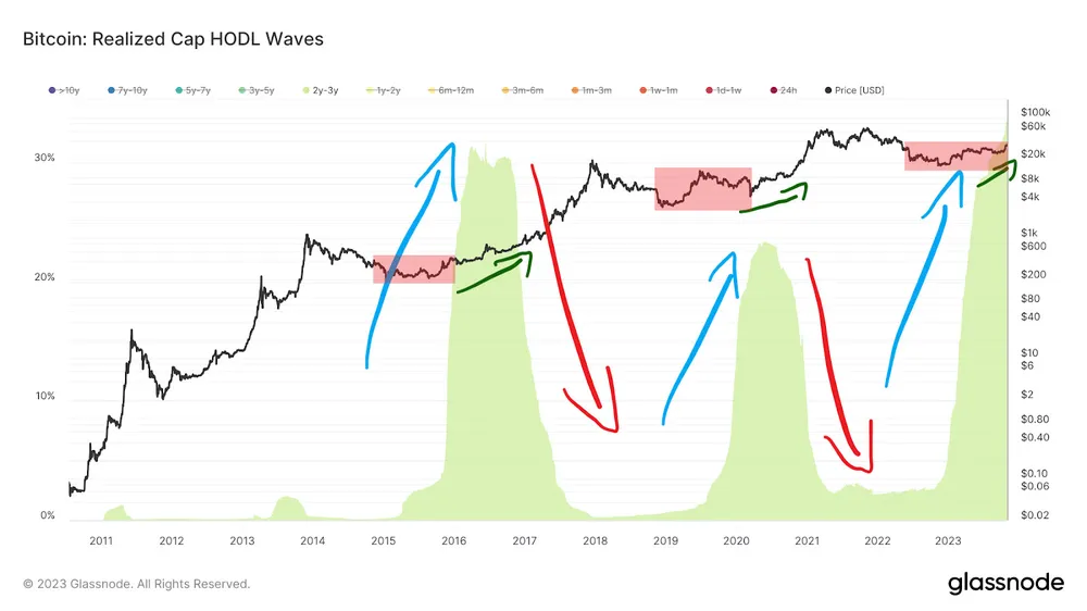 Gia tăng số lượng nắm giữ trong dải 2-3 năm (mũi tên xanh) diễn ra ngay sau khi giai đoạn tích lũy kết thúc. Động thái này xảy ra sau đáy vĩ mô của giá Bitcoin (hình chữ nhật màu đỏ). Nhóm sau đó đã đạt đến mức cao nhất trong nhiều tháng khi giá BTC từ từ tăng lên, bước vào thị trường bò trưởng thành (mũi tên màu xanh lá cây).