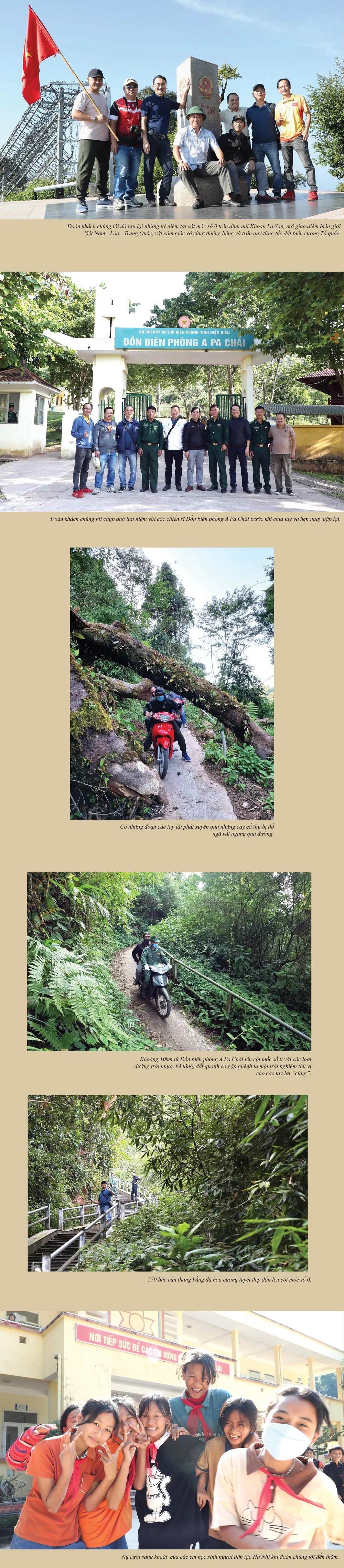 Dừng chân nghỉ ít phút, một cán bộ biên phòng dẫn đường nhắc nhở: “Bắt đầu từ đoạn này lên mốc, tất cả xe đều phải đi số 1 nhé, chỗ nào khó quá mọi người xuống dắt bộ và đẩy xe…”. Quả thực, từ trạm dừng nghỉ này lên tới chân cột mốc chỉ khoảng 3km nhưng là đường xuyên qua rừng già liên tục quanh co, gấp khúc bên vách núi cheo leo, thậm chí nhiều đoạn đường thắt lại rất nhỏ không chỉ dốc thẳng đứng còn trơn trượt, nên chỉ cần lỡ lạc tay lái là có thể lao thẳng xuống vực, nếu không cũng đâm vào vách núi.