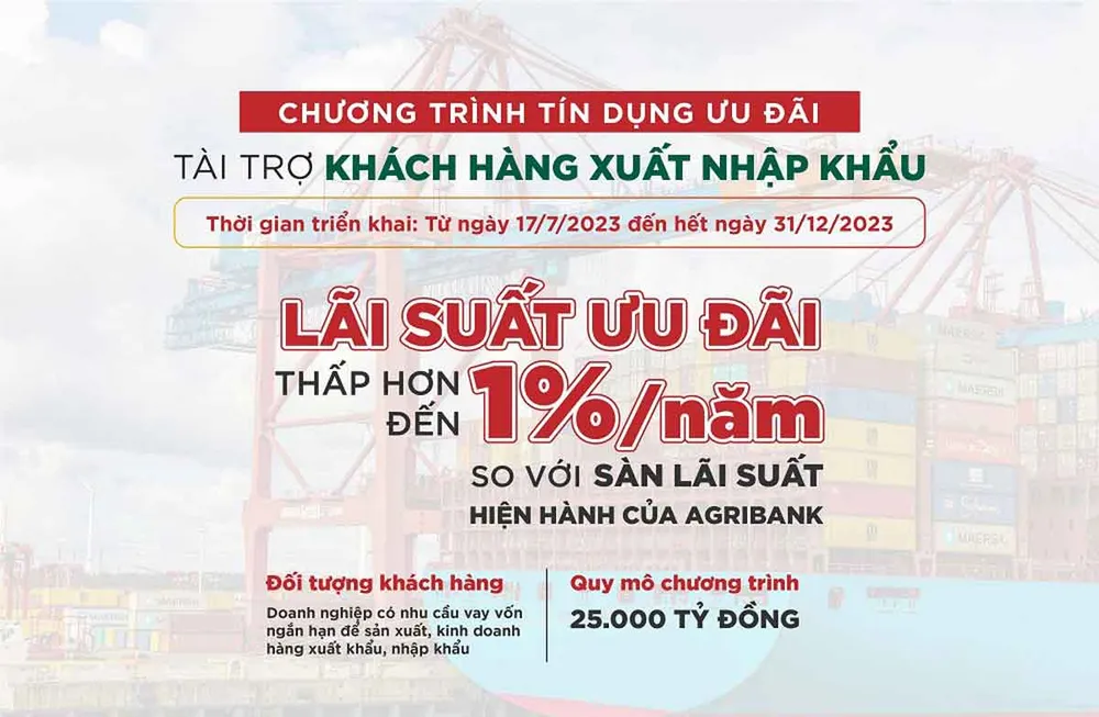 Lãi suất ưu đãi thấp hơn đến 1%/năm so với sàn lãi suất cho vay hiện hành của Agribank tương ứng đối với từng dải kỳ hạn. Ngoài ưu đãi về lãi suất, các khách hàng tham gia chương trình còn được hưởng ưu đãi hấp dẫn về tỷ giá mua bán ngoại tệ, phí dịch vụ.