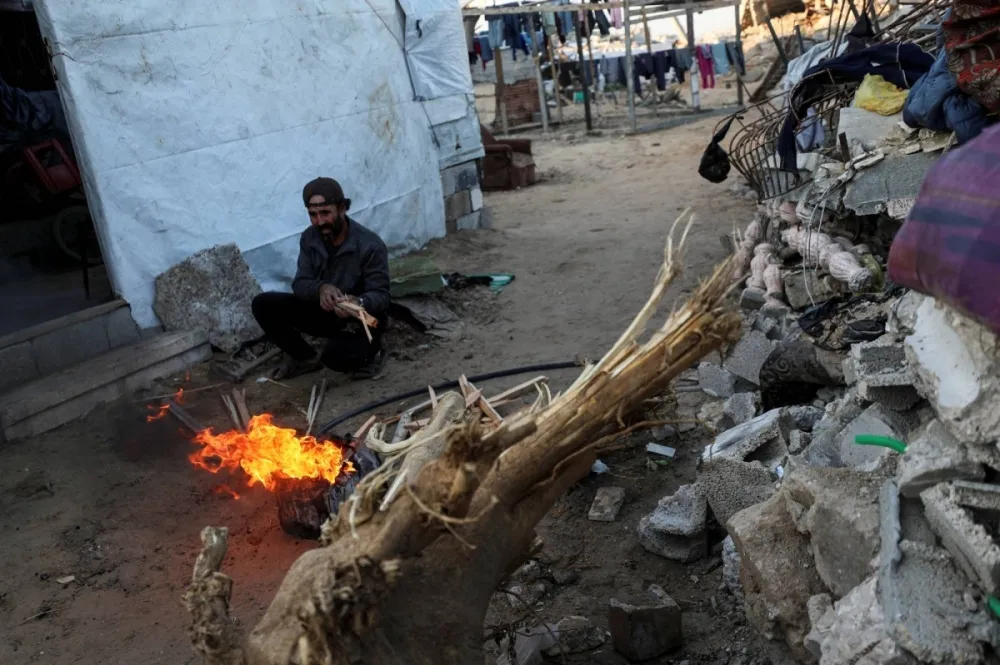Một người đàn ông ngồi cạnh đống lửa khi một gia đình người Palestine chuẩn bị bữa ăn để ăn sáng trong tháng lễ Ramadan tại trại tị nạn Jabalia vào 2/3/2025.
