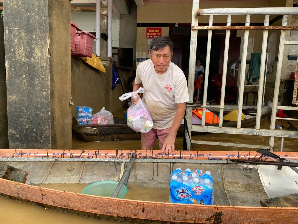 Ngồi trên chiếc thuyền nhỏ, chị Lê Thị Hà, Trưởng Ban công tác Mặt trận thôn An Lợi Tây, phân chia từng gói mì, chai nước, ghé từng nhà để trao tận tay người dân. Nghe có đoàn cứu trợ đến, người dân lội bì bõm ra trước nhà để nhận nhu yếu phẩm sau 4 ngày vật vã sống chung với lũ.