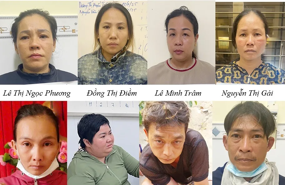 Các đối tượng bị tạm giữ gồm: Phan Văn Triết (SN 1984) được xác định là đối tượng chủ mưu, cầm đầu; Lê Thị Ngọc Phương (SN 1987); Đồng Thị Điềm (SN 1987, cùng trú TP Long Xuyên, tỉnh An Giang); Nguyễn Thanh Dũng (SN 1982); Nguyễn Thị Gái (SN 1985, cùng trú huyện Châu Phú, tỉnh An Giang); Lê Hoàng Vũ (SN 1983, trú thị xã Tân Châu, tỉnh An Giang); Nguyễn Thị Mộng Nghi (SN 1995, trú quận Thốt Nốt, TP Cần Thơ); Nguyễn Thị Kim Nguyên (SN 1993, trú huyện Châu Thành A, tỉnh Hậu Giang) và Lê Minh Trâm (SN 1992, trú TP Rạch Giá, tỉnh Kiên Giang).