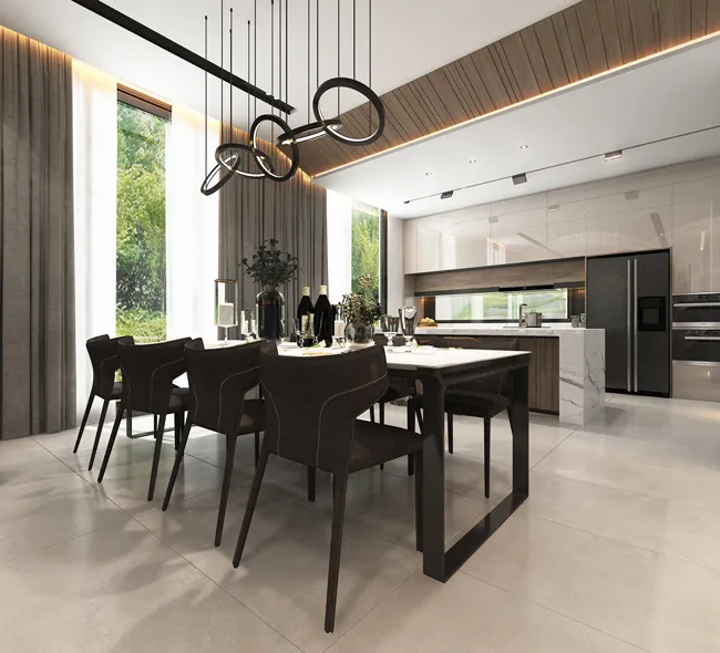 Không gian tầng trệt thiết kế theo một trục đối xứng từ sảnh đón, phòng khách bàn ăn vào tới bếp kết hợp với hệ khung cửa kính cao bắt trọn view hồ bơi bên ngoài tạo cảm giác “không ranh giới” giữa kiến trúc và nội thất. Hồ bơi bố trí theo chiều dọc khu đất, là điểm nhấn cảnh quan chính cho không gian phòng khách, bàn ăn và khu bếp.