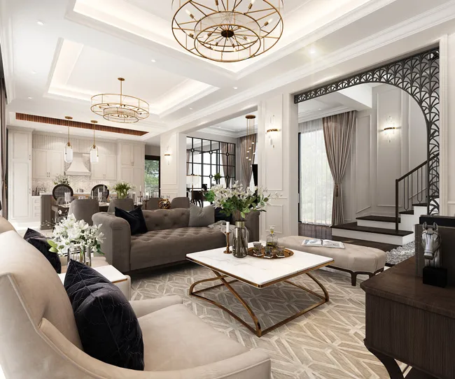 Không gian nội thất theo phong cách bán cổ điển phù hợp chung với xu hướng đương đại sang trọng nhưng vẫn tạo được nét riêng của thiết kế. Tổng thể từ khối kiến trúc và không gian nội thất sử dụng gam màu trung tính sáng ấm, không quá tối tạo nên sự hoài hòa. Lõi thang bộ hướng ra mặt tiền vừa tối ưu hóa diện tích sử dụng, vừa kết hợp tạo điểm nhấn cho mặt tiền kiến trúc.