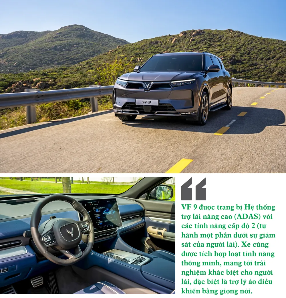 VF 9 được trang bị Hệ thống trợ lái nâng cao (ADAS) với các tính năng cấp độ 2 (tự hành một phần dưới sự giám sát của người lái). Xe cũng được tích hợp loạt tính năng thông minh, mang tới trải nghiệm khác biệt cho người lái, đặc biệt là trợ lý ảo điều khiển bằng giọng nói.