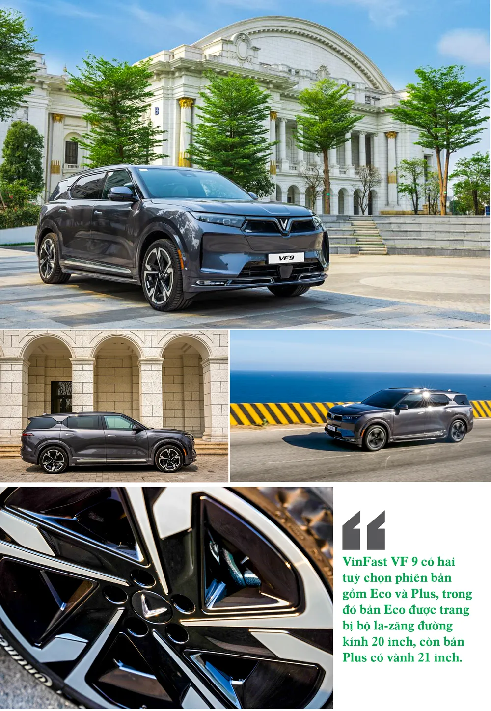 VinFast VF 9 có 2 tuỳ chọn phiên bản gồm Eco và Plus, trong đó bản Eco được trang bị bộ la-zăng đường kính 20 inch, còn bản Plus có vành 21 inch.