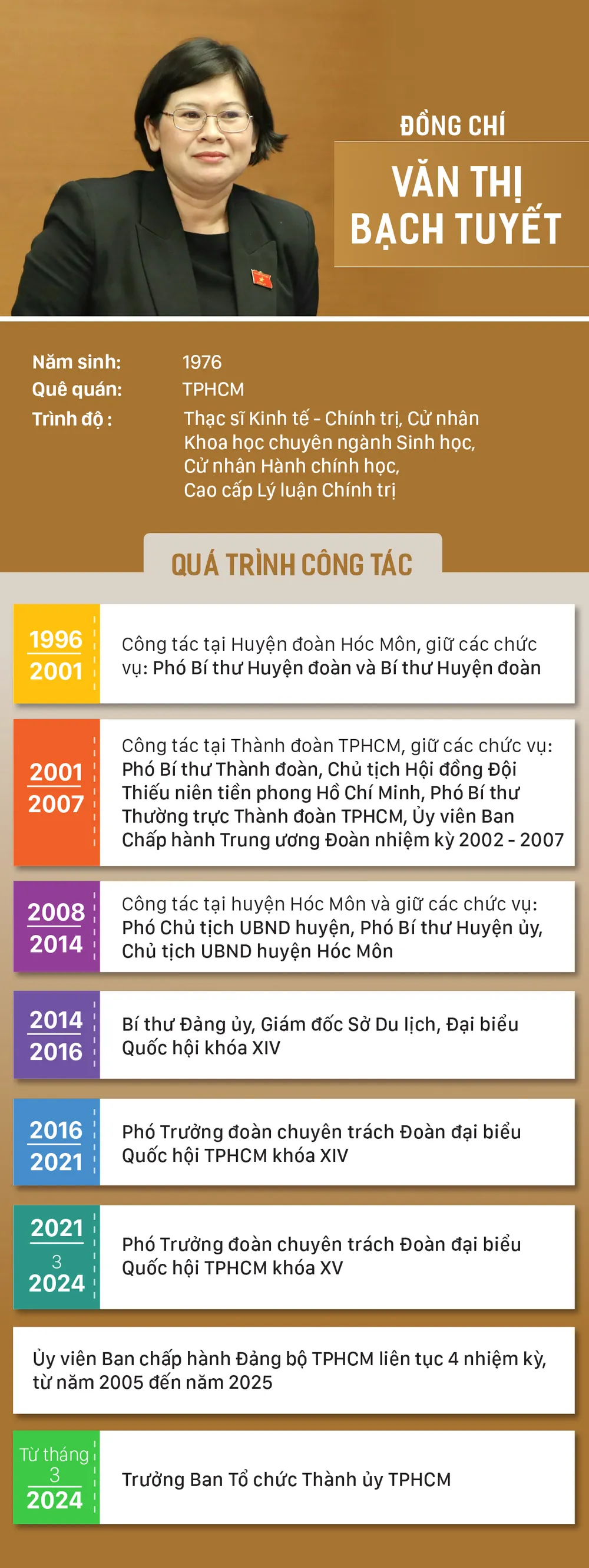 Theo đó, Ban Thường vụ Thành ủy TPHCM quyết định điều động, phân công đồng chí Văn Thị Bạch Tuyết, Thành ủy viên, Phó Trưởng đoàn chuyên trách Đoàn đại biểu Quốc hội TPHCM giữ chức Trưởng Ban Tổ chức Thành ủy TPHCM.