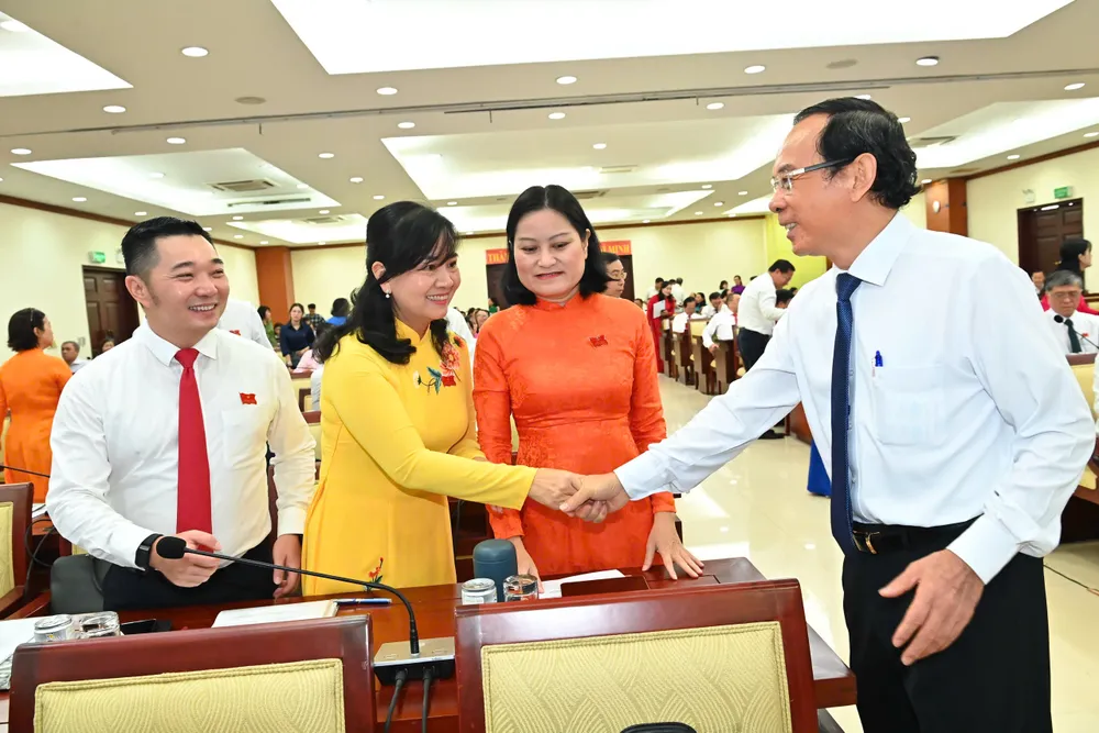Bí thư Thành ủy TPHCM Nguyễn Văn Nên trao đổi cùng đại biểu tại kỳ họp. Ảnh: VIỆT DŨNG