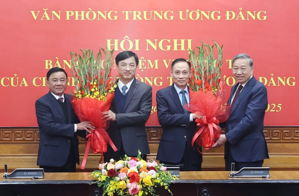 Tổng Bí thư Tô Lâm và Thường trực Ban Bí thư Trần Cẩm Tú chúc mừng ông Nguyễn Duy Ngọc, Ủy viên Bộ Chính trị, Bí thư Trung ương Đảng, Chủ nhiệm Ủy ban Kiểm tra Trung ương và ông Lê Hoài Trung, Bí thư Trung ương Đảng, Chánh Văn phòng Trung ương Đảng. Ảnh: TTXVN