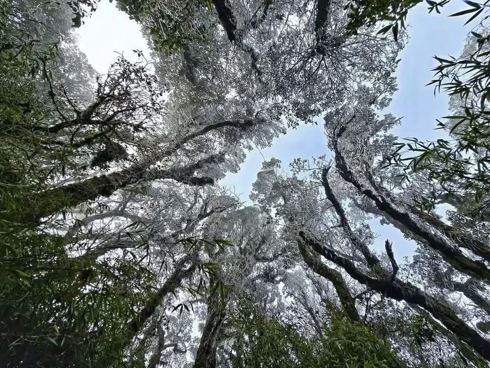 Băng giá bám thành lớp dày ở đỉnh Tà Xùa (Yên Bái). Ảnh: GIÀNG HẠNH PHÚC