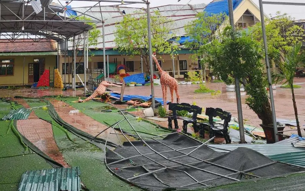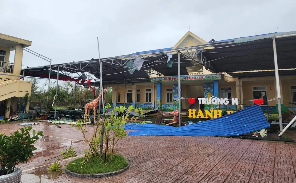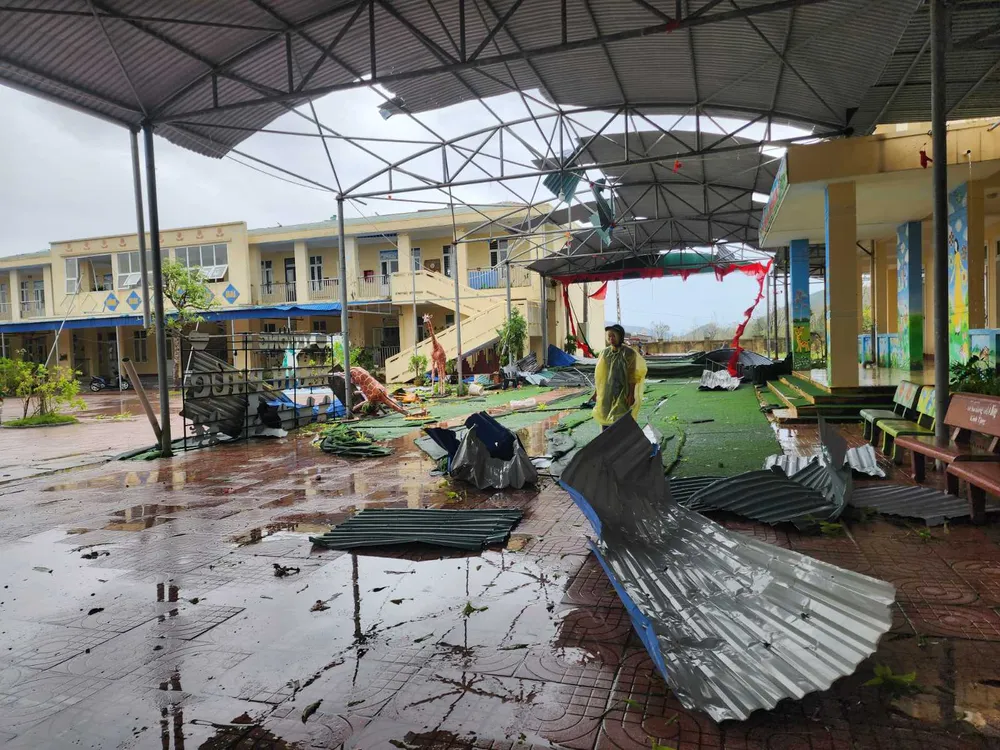 Cô Nguyễn Thị Lợi, Phó Hiệu trưởng nhà trường cho biết, đơn vị có 13 lớp với 333 học sinh ở 3 độ tuổi, cùng hệ thống nhà học, nhà hiệu bộ, nhà ăn và phòng chức năng. Trước đó, ảnh hưởng từ bão số 5 đã gây thiệt hại hơn 200 triệu đồng nhưng chưa kịp khắc phục xong thì nay tiếp tục chịu thiệt hại nặng nề hơn do bão số 10, ước tính ban đầu lên đến hàng tỷ đồng.