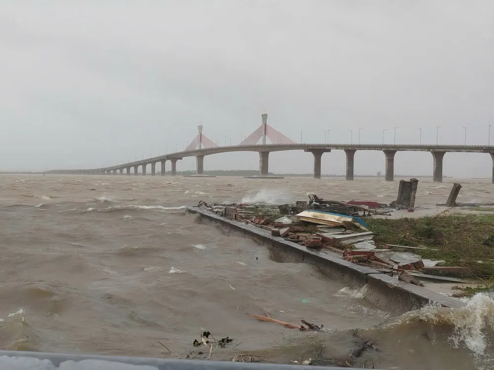 Đặc biệt, hàng chục trụ điện bị gió bão quật gãy, đổ ngổn ngang. Trên tuyến đường ven biển, nhiều trụ điện đổ chắn ngang lòng đường, gây cản trở giao thông. Toàn khu vực hiện đang bị mất điện.