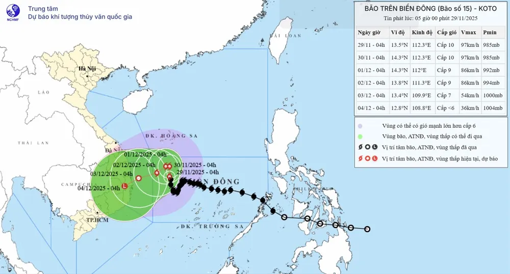 Cập nhật thông tin từ Trung tâm Dự báo khí tượng - thủy văn quốc gia, sáng sớm 29-11, tâm bão số 15 ở khoảng 13,5 độ Vĩ Bắc - 112,3 độ Kinh Đông, cách đảo Song Tử Tây khoảng 310km về phía Tây Bắc. Hiện tại, bão suy giảm cấp xuống còn cấp 9-10 (75-102km/giờ), giật cấp 13 và đang di chuyển theo hướng Bắc Tây Bắc, tốc độ 5-10km/giờ.
