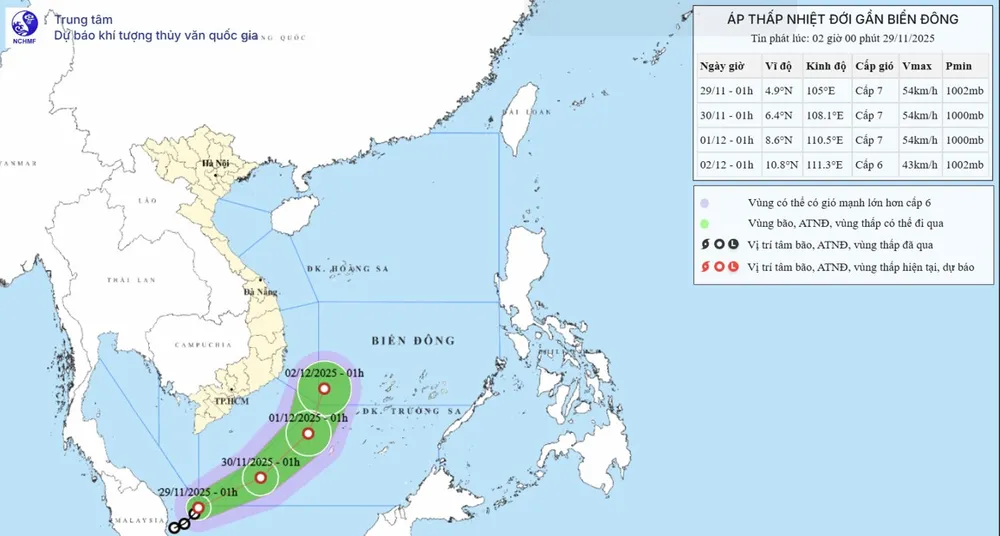 Vị trí và dự báo quỹ đạo của áp thấp nhiệt đới sáng sớm 29-11. Nguồn: Trung tâm Dự báo khí tượng - thủy văn quốc gia