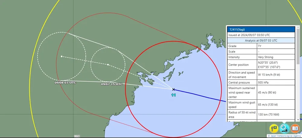 Dự báo hướng đổ bộ của bão số 3 (Yagi) theo nhận định của Cơ quan Khí tượng Nhật Bản gần trưa 7-9