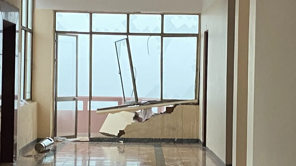 Hồi 13 giờ 30 một bức tường của một khách sạn ở quận Đồ Sơn (TP Hải Phòng) bị gió bão đánh vỡ. Ảnh: VĂN PHÚC